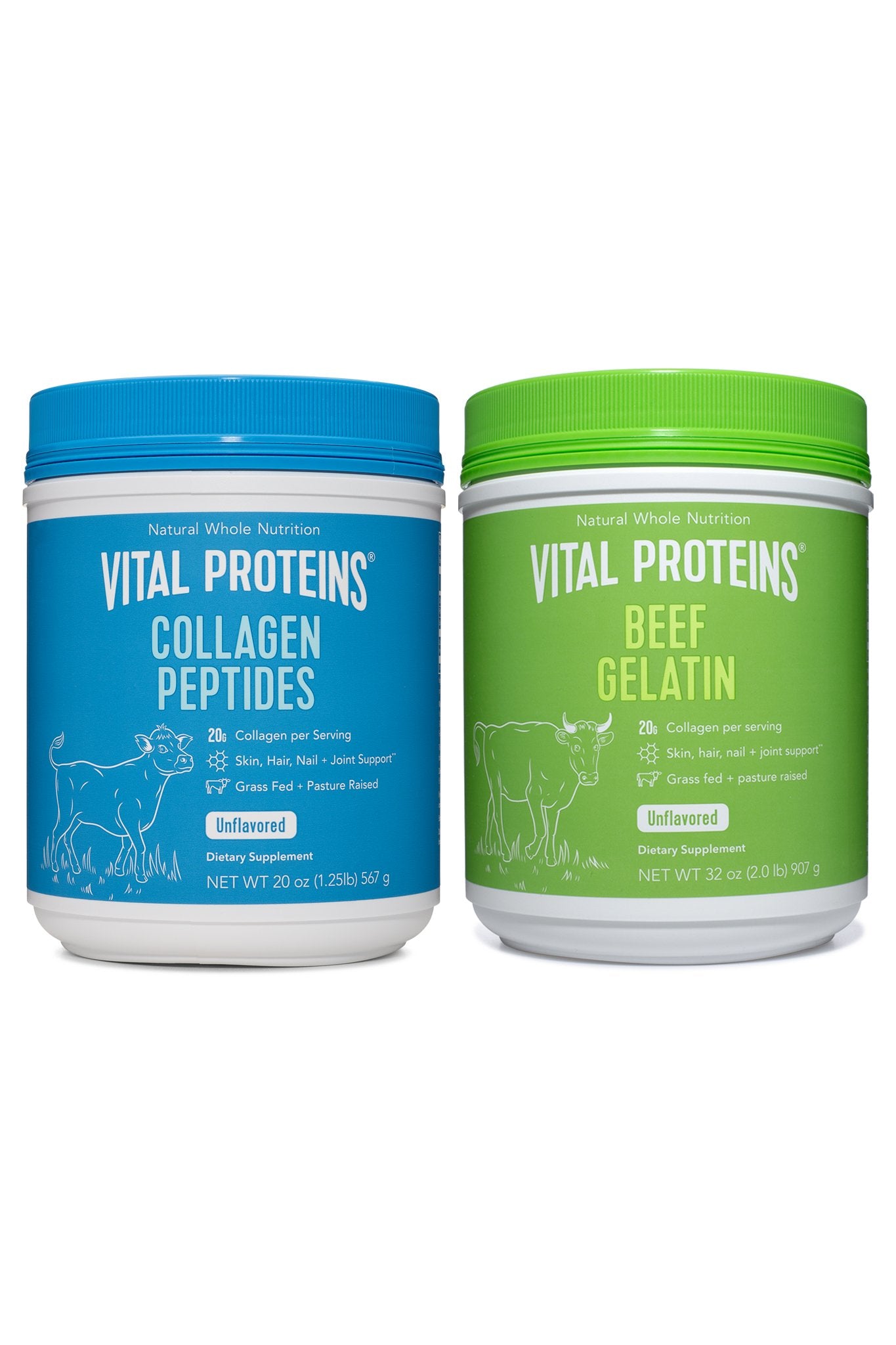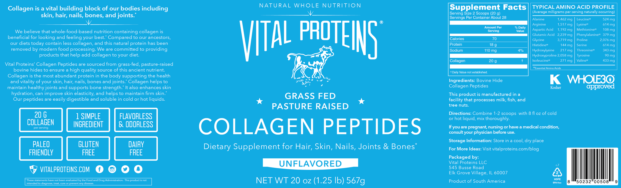 Our collagen protein is a pasture-raised, grass-fed bovine hide gelatin powder. It offers comprehensive benefits for health, fitness, and beauty. Collagen protein is often used to promote digestive health. The gelatin can be mixed into both hot and cold liquids, but will gel if blended in cold. It is gluten free, Non-GMO, sugar free, paleo friendly and Whole30® Approved. Vital Proteins Collagen Peptides are sourced from grass-fed, pasture-raised bovine hides to ensure a natural, high quality, and sustainable source of this ancient nutrient. Collagen is the most abundant protein in the body ensuring the health and vitality of your skin, hair, tendon, cartilage, bones, and joints.** These natural peptides are highly bio-available, digestible and soluble in cold or hot liquids.