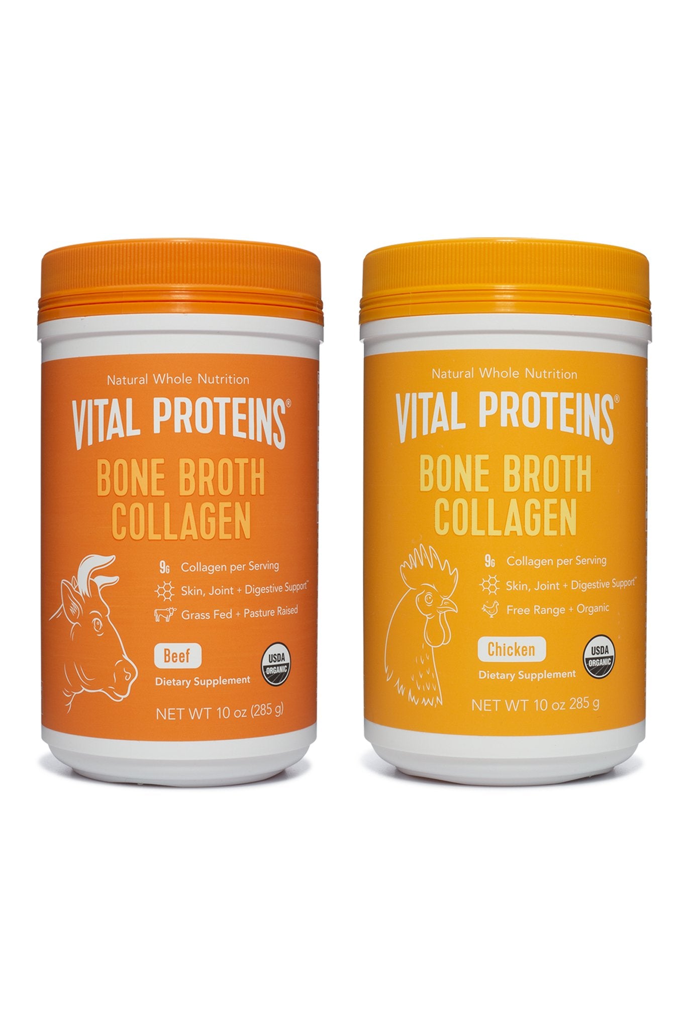 10oz Chicken Bone Broth (BBCU10R) + 10oz Beef Bone Broth (BBBU10R) Bone broth is nature’s richest source of collagen and is a valued part of traditional diets. Bone Broth Essentials brings the benefits of both our Chicken and Beef Bone Broth to your kitchen. Both Bone Broth Powders are crafted with USDA organic, free-range chicken and grass-fed beef. Slowly simmered to extract maximum nutrients, this simple antibiotic and hormone free formula results in a light, nourishing broth packed with collagen protein for overall digestive support, increased joint strength, and hair, skin and nail health.** It’s convenient to use and mixes well in water, savory beverages, and your favorite recipes.