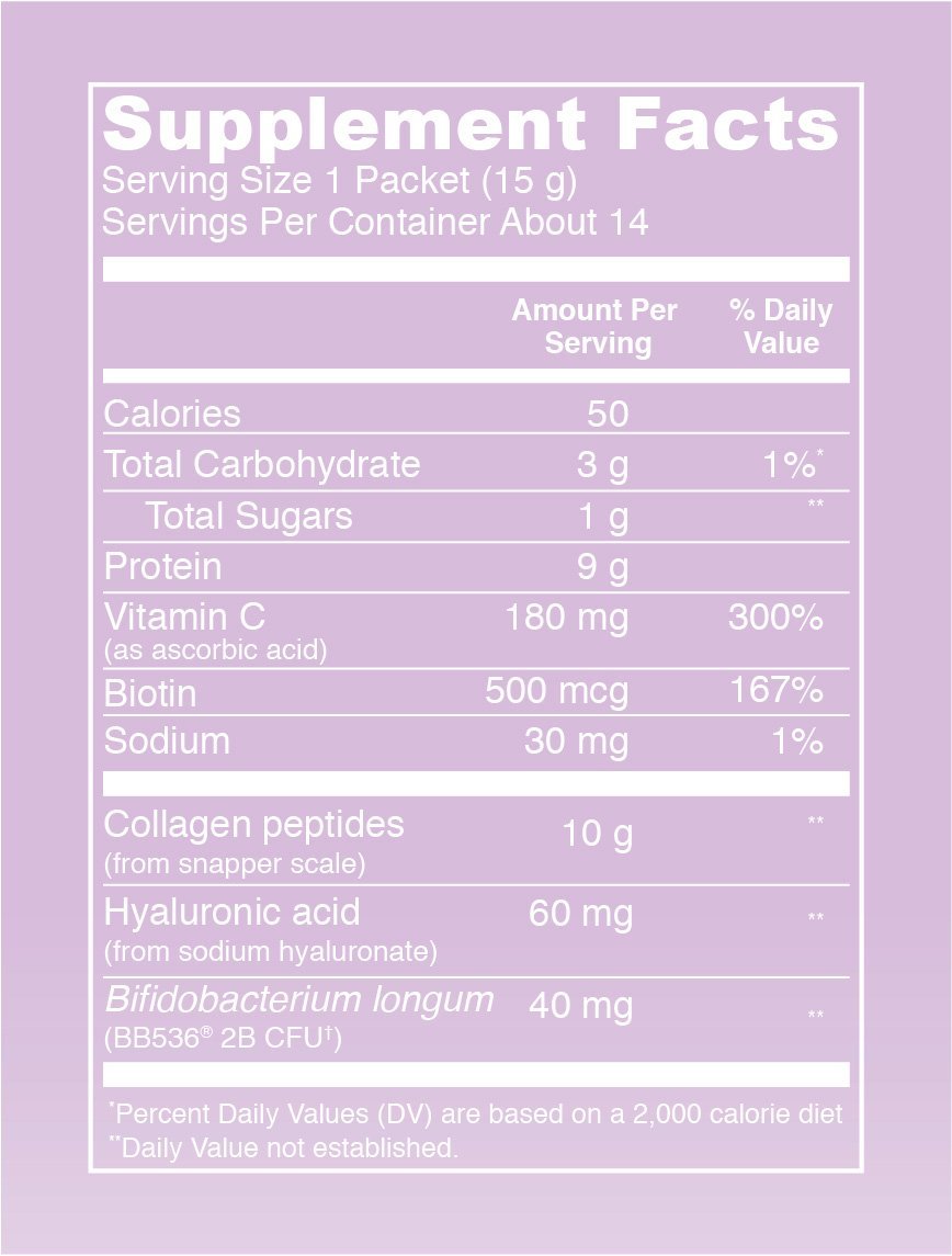 For radiant skin and beauty both inside and out, Collagen Beauty Glow is made with marine-based collagen peptides, hyaluronic acid, and probiotics. For that extra glow, we've added your daily dose of vitamin C and biotin. This delicious elixir is the perfect addition to water, smoothies, teas and more.